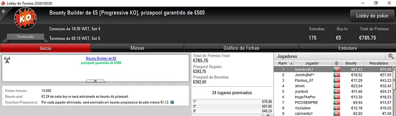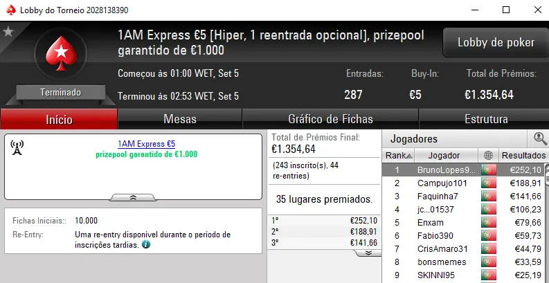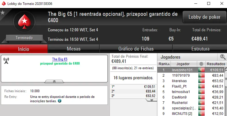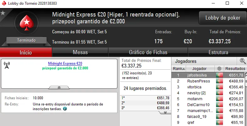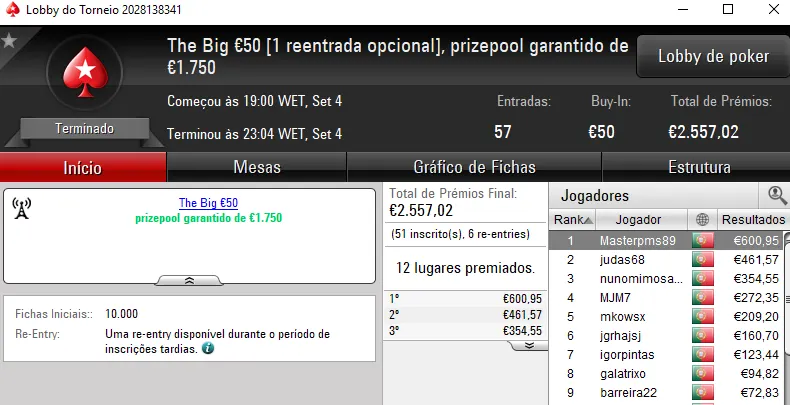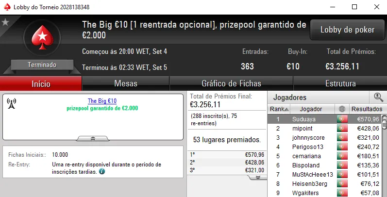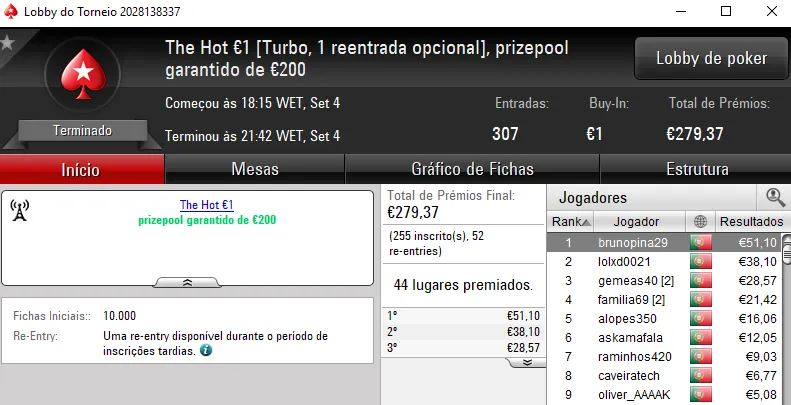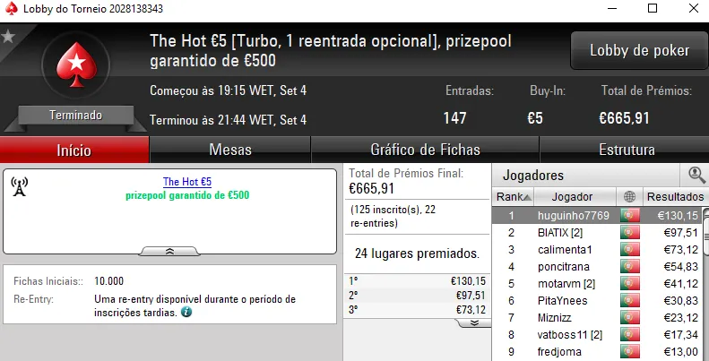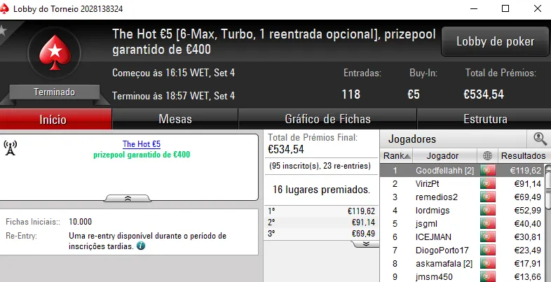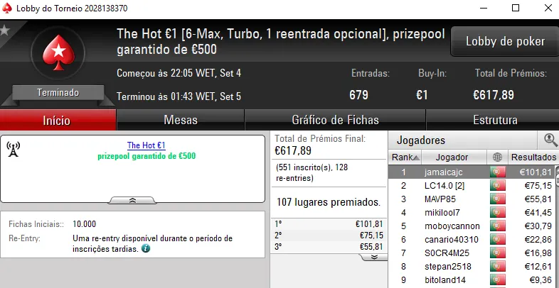 Já o The Hot BigStack Turbo €50 contou com 117 entradas e o prize pool de €5,303 foi repartido pelos 18 melhores classificados. Fellini33 arrecadou o título e €1,379 de prémio. Na segunda posição jgrhajsj levou para casa €928. Com o terceiro lugar, kazkaz17 arrecadou €689.