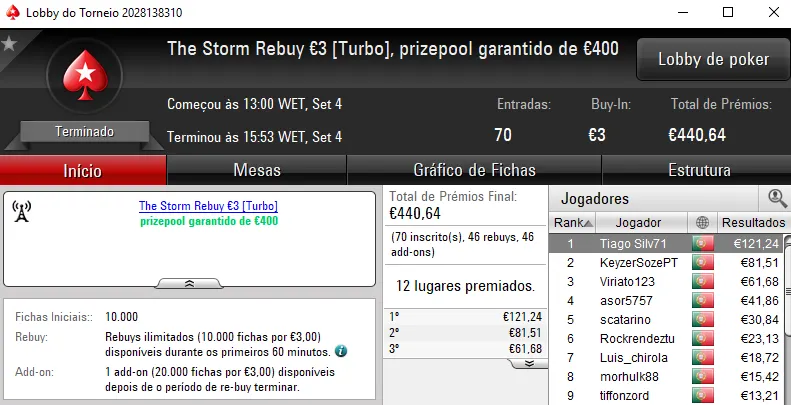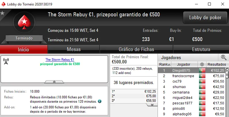 O Sunday Storm €10 foi bastante concorrido e contou com 1,016 registos que perfizeram um prize pool total de €9,113. Os três jogadores do pódio dividiram os prémios de forma igual e todos receberam €1,088. No primeiro posto ficou vbarbucha, em segundo SrMikeMartin e em terceiro Rafael Perpe.