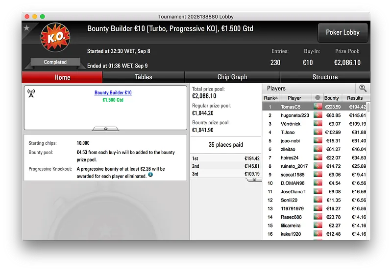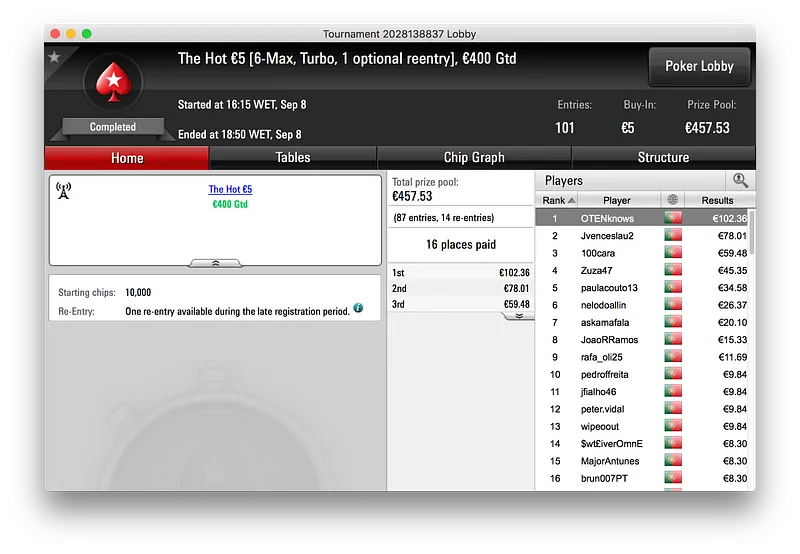 O maior prémio ficou nas mãos de kazkaz17 que bateu o field composto por 113 entradas e se sagrou campeão do Hot BigStack Turbo €50. O prize pool ascendeu aos €5.122 e foram 18 os jogadores pagos. No final, kazkaz17 bateu vaskinho705 (2º - €896) heads-up para receber a maior fatia do prize pool equivalente a €1.331.