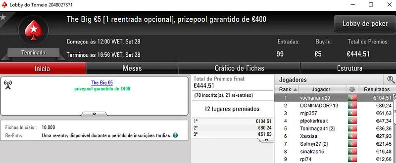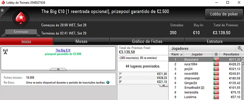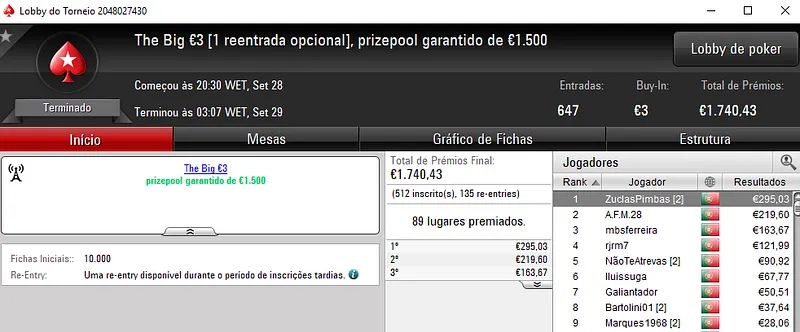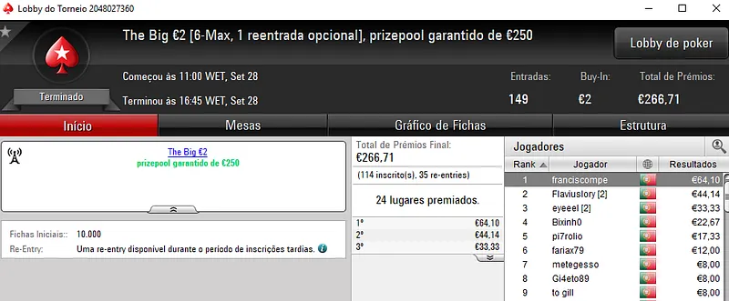 O The Big €100 contou com 41 entradas e o prize pool de €3,716 foi repartido pelos 9melhores jogadores. Com o título, v@gitarian levou para casa €1,115 de prémio. A medalha de prata rendeu €743 a joana t7. No terceiro lugar do pódio, wannab333 embolsou €557.