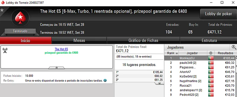 As 133 entradas registadas no The Hot BigStack Turbo €50 mostram bem a popularidade deste torneio. Mais uma vez, o primeiro prémio rendeu quatro dígitos, €1,447, que foram parar à conta de krisraquel7. No segundo lugar, ruiven este próximo dos €1,000 e recebeu €997. Já PMB2016 faturou €753 na terceira posição.