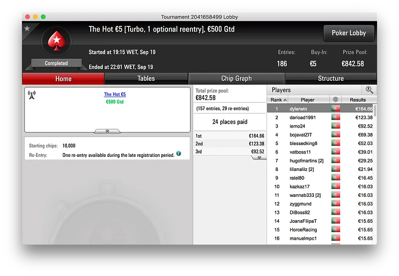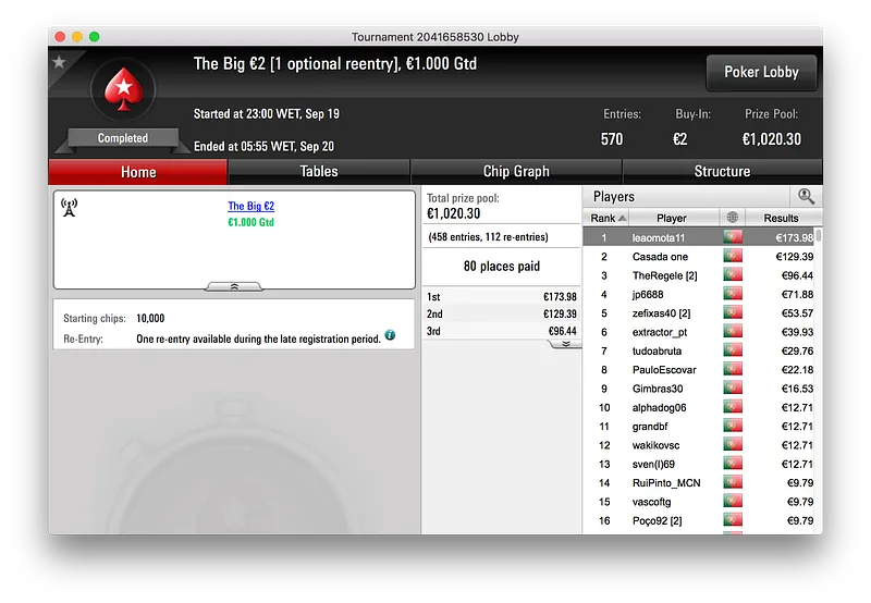 Por fim, AAorAA7, o vencedor do Super Tuesday Big €10 embolsou €1.031 depois de levar a melhor sobre os 701 adversários que jogaram o torneio. Foram precisass 6:43h para encontrar o vencedor e foi JOHNNY277 (2º - €765) o último a cair perante AAorAA7 que se sagrou campeão e levou a maior fatia do prize pool de €6.296.