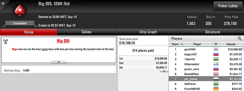 Na PokerStars, Pedro "pm_marke" Marques foi o melhor português entre os 1.562 jogadores e alcançou mesmo a mesa final do Big $55. Infelizmente, Marques caiu antes de chegar perto do primeiro prémio de $10.698, na 7.ª posição embolsando, ainda assim, $1.131.