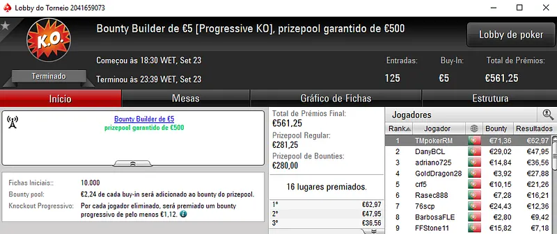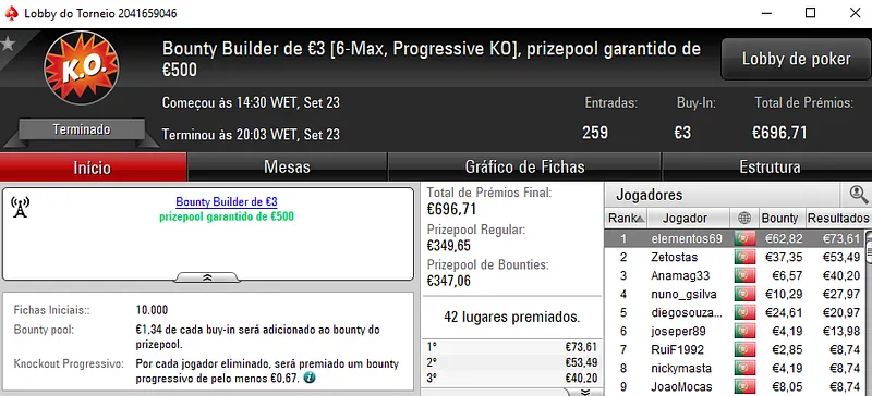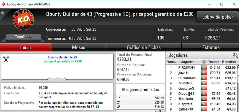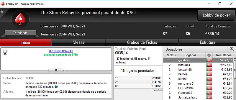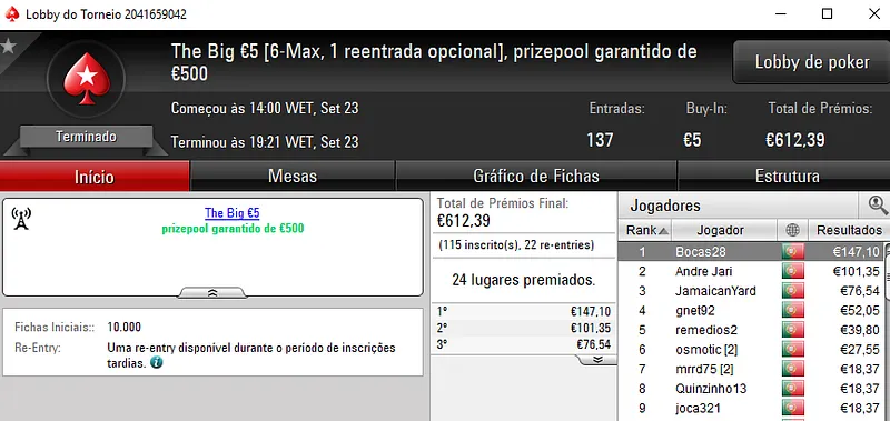 A sessão de ontem na sala de poker online nacional fica marcada pela entrega de apenas um prémio de 4 dígitos.