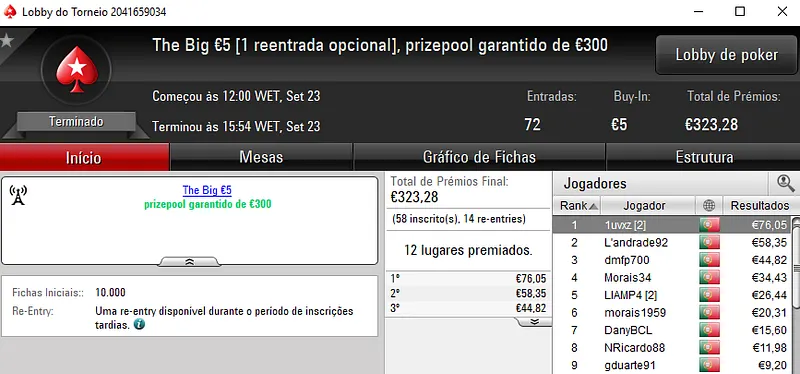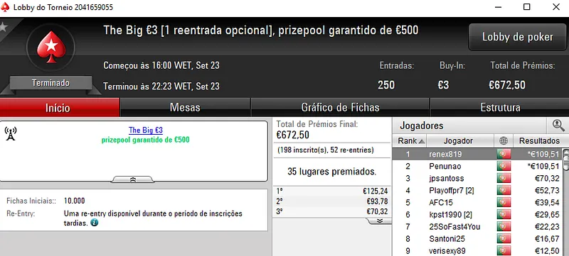 O vencedor do dia foi 1uvxz que depois de realizar duas entradas no torneio conseguiu sair com o título e €1,106 no The Big €100. Este torneio registou 33 entradas e o prize pool de €2,991 foi distribuído pelos 6 melhores classificados. No segundo posto, rotiv azar 2 encaixou €747 de prémio, enquanto AAEUKK levou €448 no último lugar do pódio.