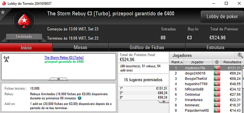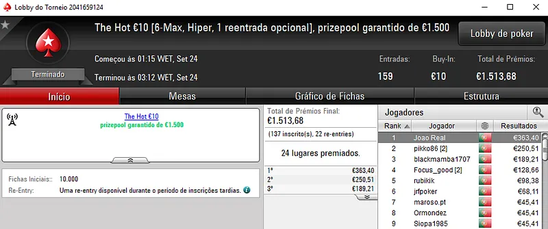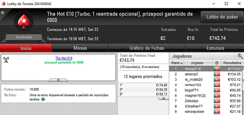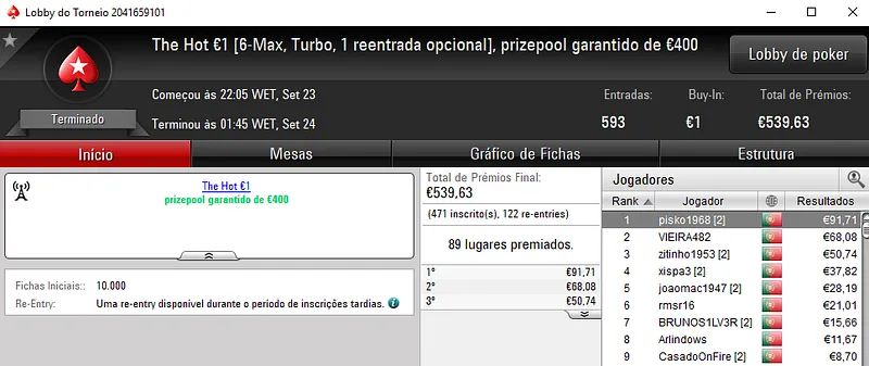 O The Hot BigStack Turbo €50 não premiou nenhum jogador com prémio de 4 dígitos, mas andou bem perto. As 75 entradas registadas deram origem a um prize pool de €3,399, onde kiwis69 recebeu €926 no primeiro lugar. GIN & SONIC em segundo (€620) e jgrhajsj em terceiro (€475) completam o pódio dos prémios.