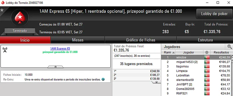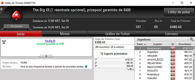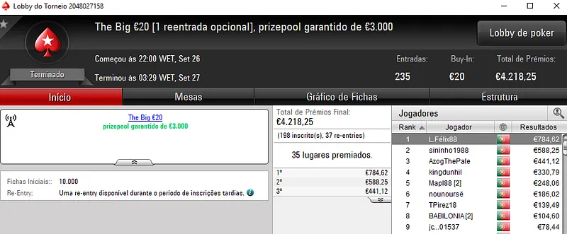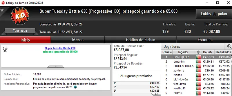 Invok88 ainda recebeu um prémio de 4 dígitos no Super Tuesday Big €10. Pelo primeiro lugar faturou €1,042, depois de vencer MonkeyyDJ no heads-up (€773). NOFEAR2500 ficou em terceiro e recebeu €574.