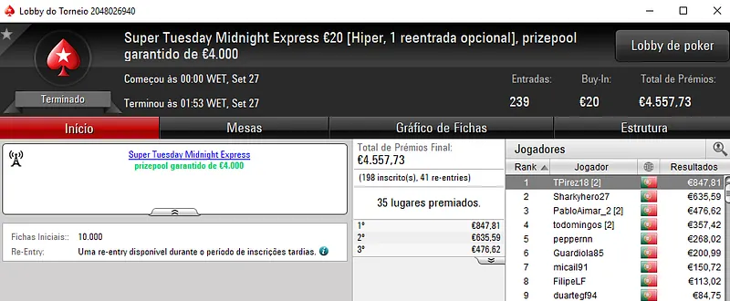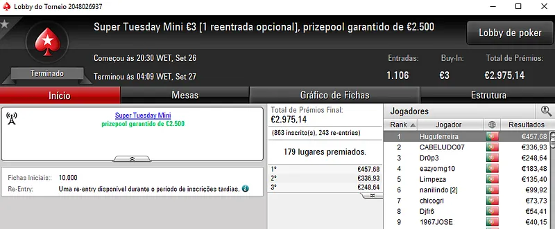 As 115 entradas registadas no Super Tuesday Warm-Up €50 resultaram num prize pool de €5,158 a ser distribuído pelos 16 melhores classificados. No primeiro lugar, hugofmartins levou para casa €1,153 de prémio. SF0591 terminou em segundo e engordou a conta em €879. A fechar o pódio, Fellini33 faturou €670 no terceiro lugar.