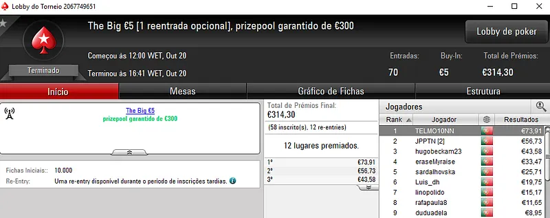 As 27 entradas registadas no The Big €100 não chegaram para atingir o prize pool garantido de €3,000. O maior beneficiário deste overlay foi jgrhajsj que faturou €1,110 pelo primeiro lugar no torneio. A segunda posição ficou para ivanildo que levou para casa €750, enquanto AAEUKK recebeu €450 pela medalha de bronze.