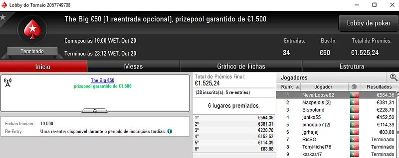 KeyzerSozePT voltou a fazer a festa no The Hot Bigstack Turbo €50. O torneio contou com 100 entradas e o prize pool chegou aos €4,533, com 18 jogadores a saírem com prémios. Depois de vencer MosesPT no heads-up, KeyzerSozePT arrecadou €1,178 de prémio. Já MosesPT levou €793 pelo segundo posto. A fechar o pódio, Fellini33 embolsou €589 de prémio.