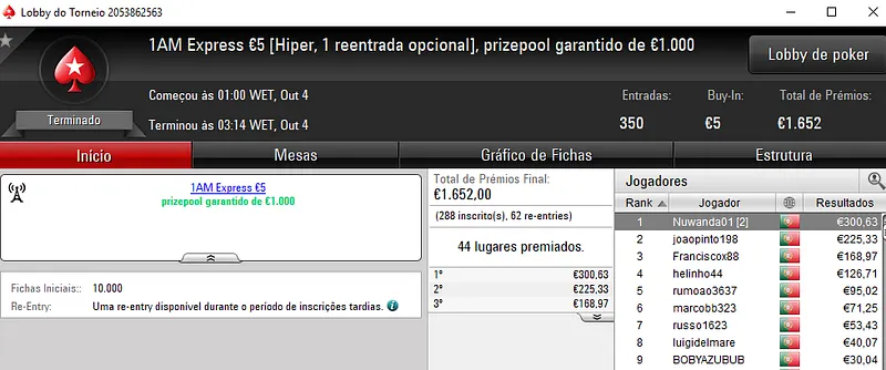 Ainda com um prémio de 4 dígitos saiu mETEOROs1993 que faturou €1,030 no Super Tuesday Midnight Express €20. O torneio contou com 297 entradas e na segunda posição RicBG embolsou €772. Já PedroFSF levou €579 pelo terceiro lugar.