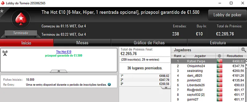 Já o The Hot BigStack Turbo €50 acolheu 156 entradas que perfizeram um prize pool de €7,071. Depois de acordo no heads-up, traganacos assegurou €1,491 de prémio pelo título, enquanto GVR96 recebeu €1,375 no segundo posto. O terceiro lugar pertenceu a policy10 que amealhou €883.