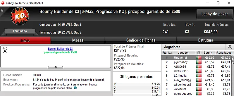 AAorAA7 foi o campeão dos knockouts no Super Tuesday Battle €30. O torneio contou com 212 participantes e para AAorAA7 ficaram reservados €1,346 entre prémio e bounties. NN_ismaz ficou na segunda posição e arrecadou €517. O terceiro lugar valeu €402 a andrelopes11.