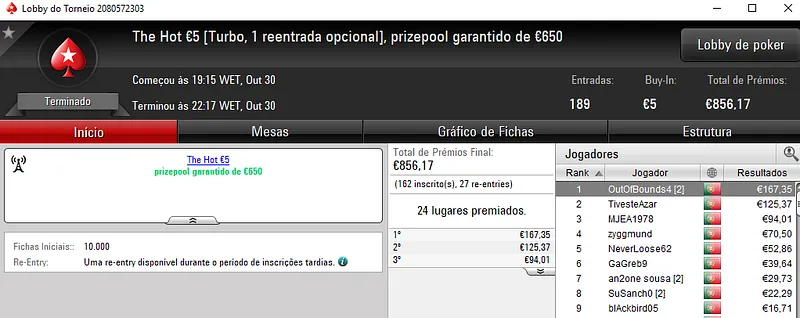 O The Hot BigStack Turbo €50 continua a fazer as delicias dos jogadores nacionais e ontem Any2Ju$t4You arrecadar o maior prémio da sessão, €1,782. O torneio contou com 171 registos que se transformaram em €7,751 de prize pool acumulado. Na segunda posição, tribetes10 faturou €1,240 e a completar o pódio, SirRuiNF.pt levou para casa €930.