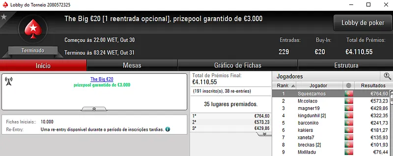 O The Big €100 também teve uma boa afluência de jogadores e contou com 65 entradas que perfizeram um prize pool de €5,892. O acordo no heads-up garantiu €1,194 a bruxadodark, no primeiro lugar e €1,253 a NPASSANADA#, na segunda posição. O terceiro posto ficou a cargo de whitequality que recebeu €817.