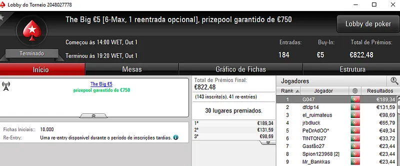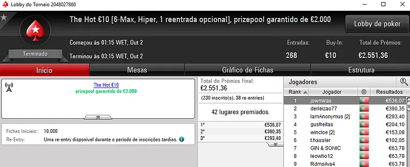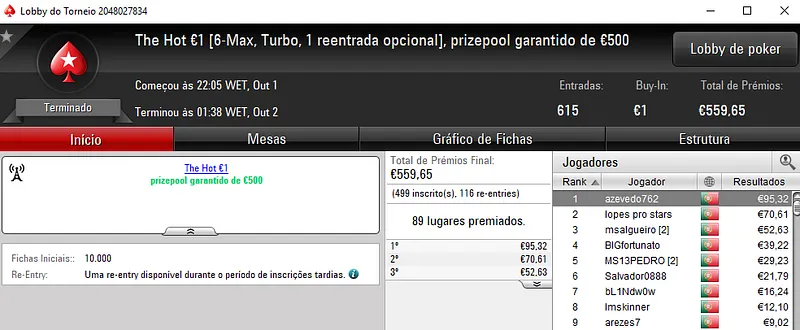 A medalha de ouro desse prémios vai para Bispoland que venceu o The Hot BigStack Turbo €50 com 189 jogadores. Os €8,567 acumulados foram distribuídos pelos 30 melhores classificados e com o título, Bispoland recebeu €1,970 de prémio. Já o segundo posto valeu €1,370 a ratito209, enquanto iDuckz levou para casa €1,028 no terceiro lugar.