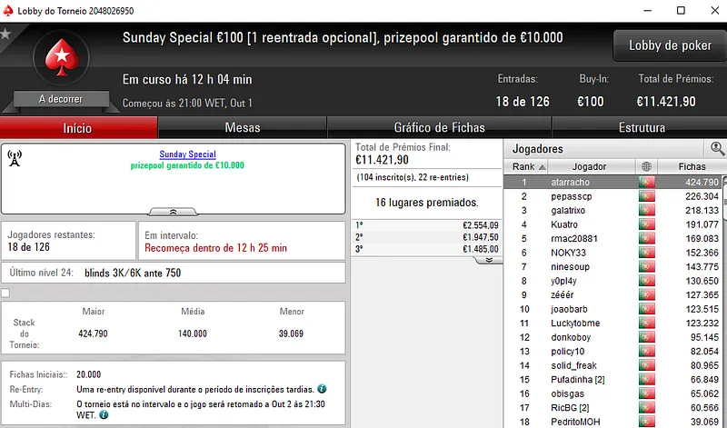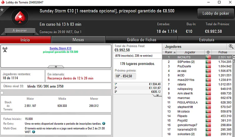 Hoje realiza-se o dia 2 do Sunday Special €100 e do Sunday Storm €10, em jogo estão mais de €21 mil.