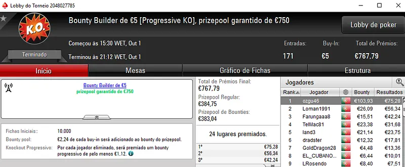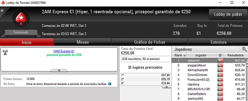 O Sunday Midnight Express €20 também garantiu um prémio de 4 dígitos. ZURC9 foi o feliz contemplado e arrecadou €1,075 depois de bater o field com 310 entradas. Stor Neca ficou na segunda posição e levou €806. A completar o pódio, Tr8gth embolsou €604.