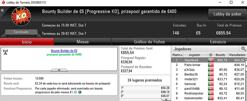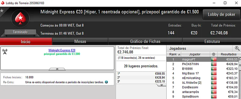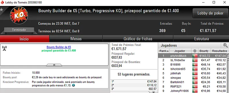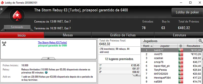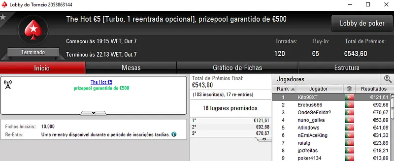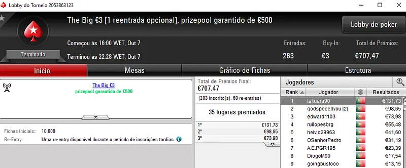 A PokerStars nacional voltou a ser palco de mais uma sessão de poker online, onde apenas um jogador saiu com um prémio acima dos mil euros.