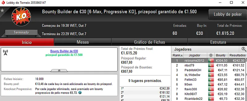 O acordo no heads-up resultou em €937 para nunocassamo e vaasckito. Estamos a falar do The Hot BigStack Turbo €50, torneio que registou 95 entradas e €4,306 de prize pool. Na terceira posição, skyrim73 faturou €559.