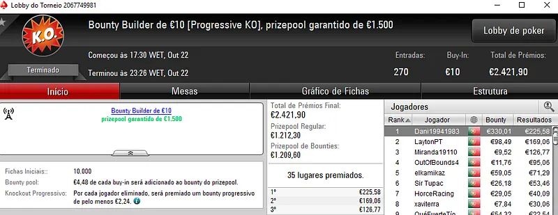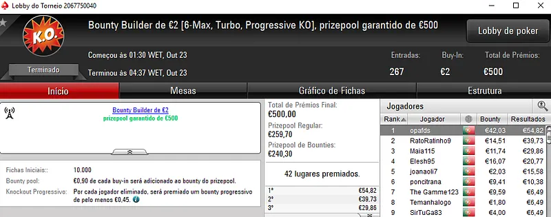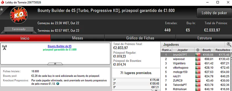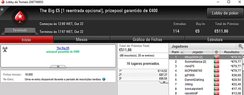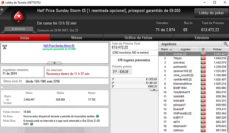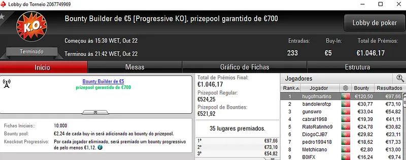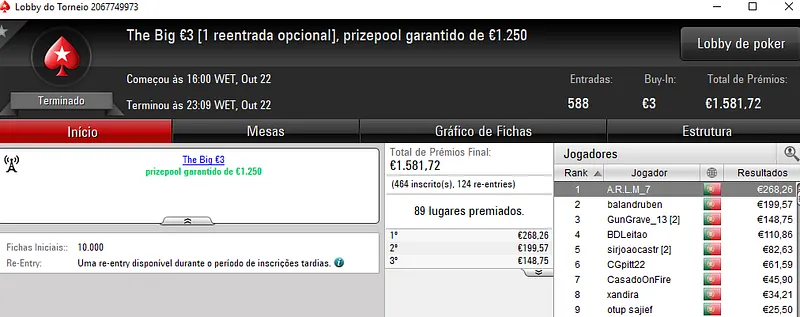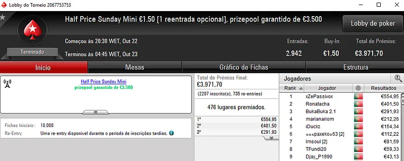Regressando ao Half Price Sunday Midnight Express €10. Este torneio entregou 2 prémio de 4 dígitos com j0nhf6 a receber €1,1492 no primeiro posto e TELMO10NN a levar €1,100 na segunda posição. Para fechar o pódio, iur71 recebeu €812 em terceiro.