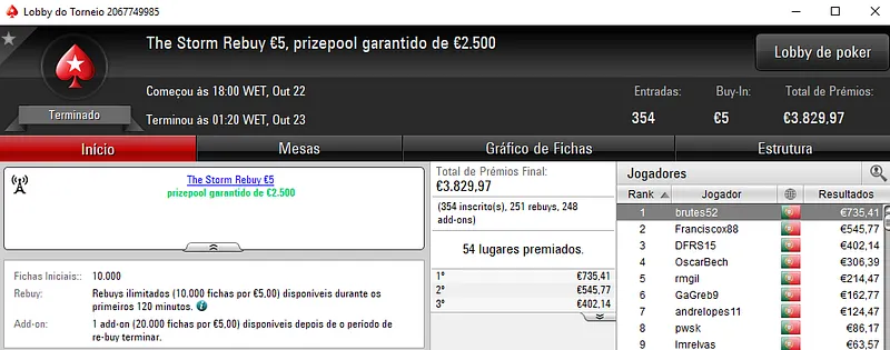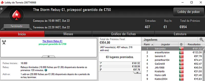 O campeão do The Storm Rebuy €10 foi xaviterra que superou o field com 259 entradas para receber €1,320 de prémio. No segundo posto, chilipe22 levou para casa €962, enquanto FMACP teve direito a €723 na terceira posição.