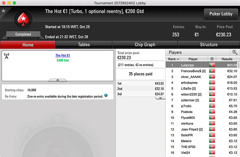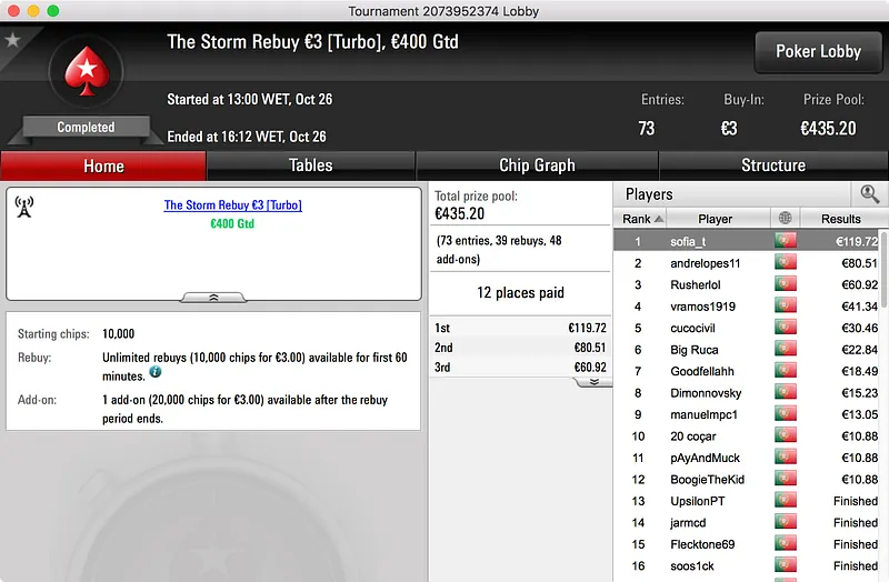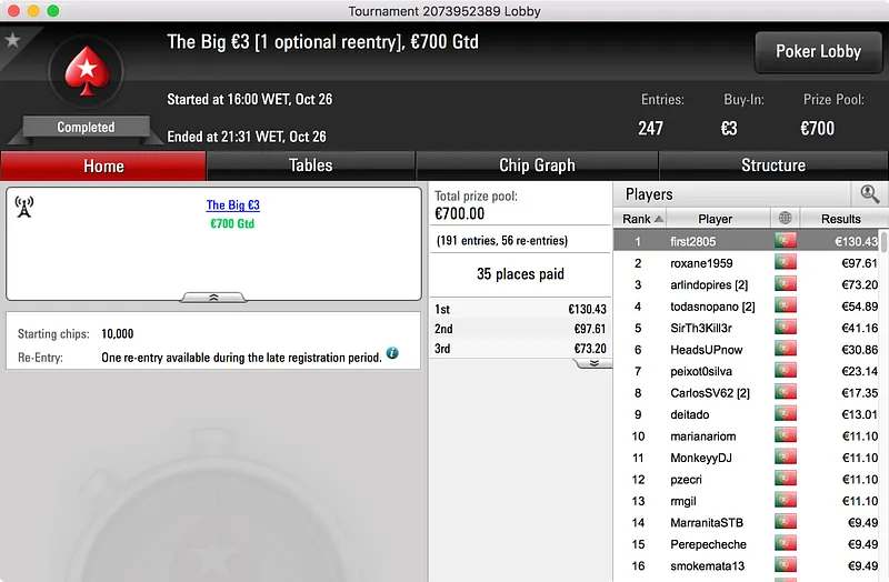 O maior prémio do dia ficou nas mãos de [IamN0n], vencedor do Hot BigStack Turbo €50. O Português derrotou os 130 adversários que encontrou pela frente e embolsou a maior fatia do prize pool de €5.938. No final, foi upapaoutai (2º - €982) o último a cair às mãos de [IamN0n] que embolsou €1.425.