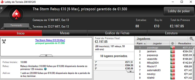 Mais um dia de poker online na PokerStars.pt e mais um dia com dois jogadores a a saírem com prémios acima de mil euros.