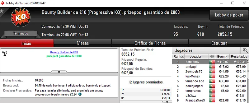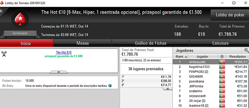 Susanch0 foi quem recebeu o maior prémio ao conquistar o The Hot BigStack Turbo €50. O torenio contou com 107 registos e para Susanch0 voaram €1,261 de prémio. Na segunda posição, amlfaria levou para casa €848, enquanto TR_farol encaixou €630 no terceiro posto.