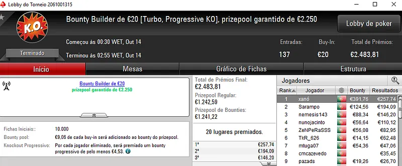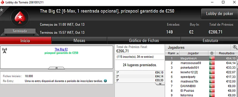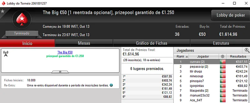 O The Big €100 contou com 38 entradas que perfizeram um prize pool de €3,444. Nove jogadores saíram com prémios e cunraio levou a maior fatia, cerca de €1,033, ao vencer o torneio. P4ul_777.pt perdeu o head-up e faturou €688. Já a terceira posição do pódio ficou para 20 coçar que recebeu €516.