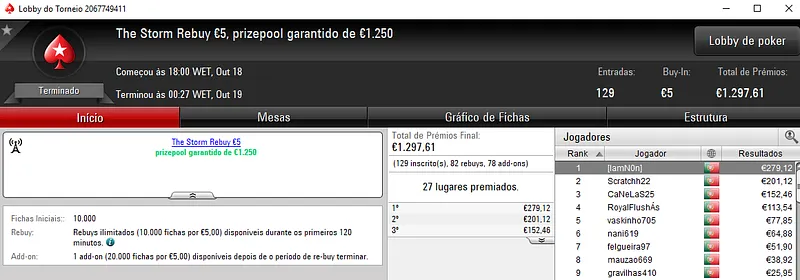 A sessão de poker online de ontem fica marcada pela entrega de mais dois prémios de quatro dígitos pela sala de poker online nacional, a PokerStars.pt.