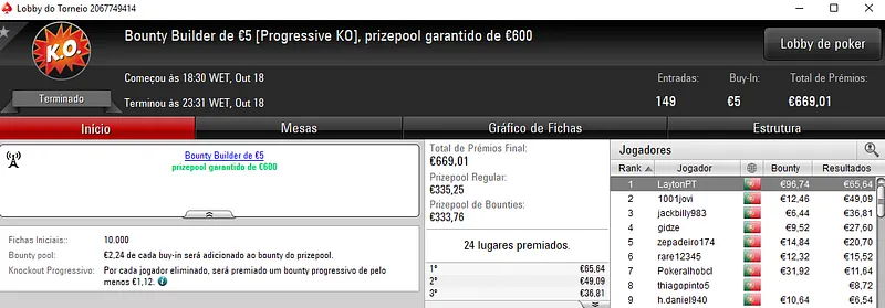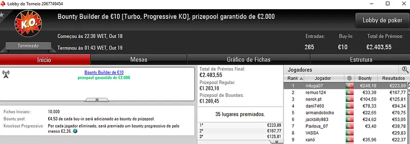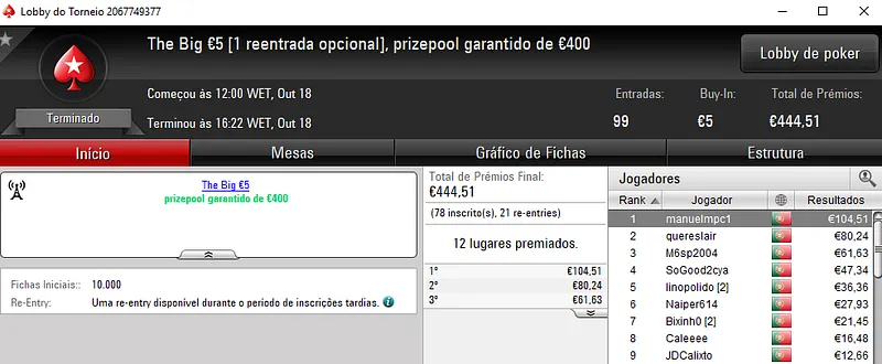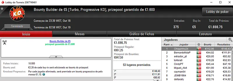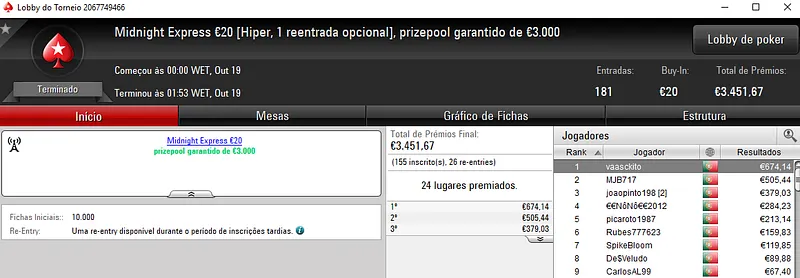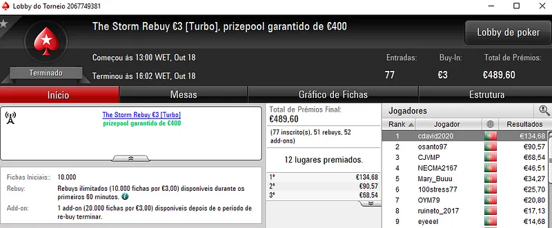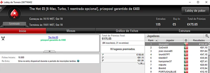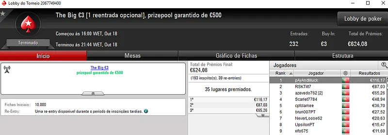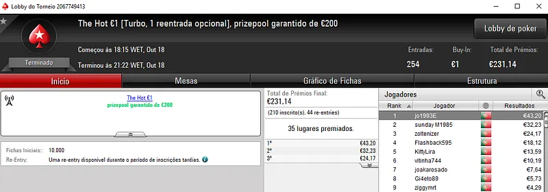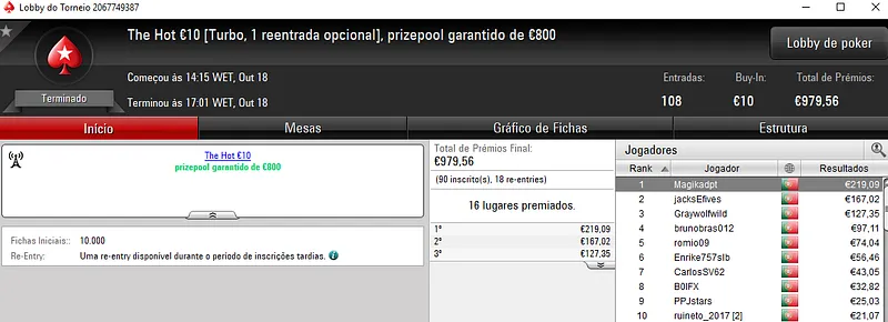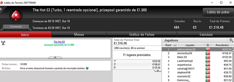 Prey223 levou o maior prémio do dia ao conquistar um dos torneios preferidos dos jogadores nacionais, o The Hot BigStack Turbo €50. Com 119 entradas registadas, este torneio teve um prize pool acumulado de €5,394 que deram direito a €1,402 para Prey223. Muito próximo dos 4 dígitos ficou xaneta7 que recebeu €943 no segundo lugar. A fechar o pódio, Vieira.Lr encaixou €701 de prémio.