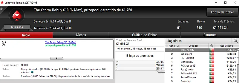 Já o The Big €100 contou com 43 entradas que perfizeram um prize pool de €3,897. A maior fatia do bolo ficou para whitequality que faturou €1,169 depois de vencer 10rmc10 no heads-up (€779). A terceira posição ficou a cargo de matana08 que embolsou €584.