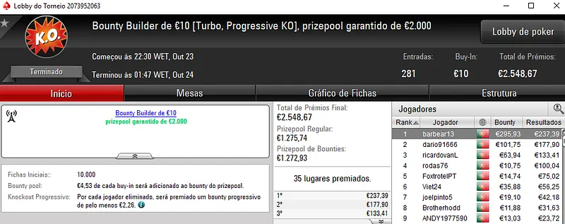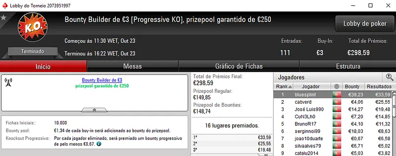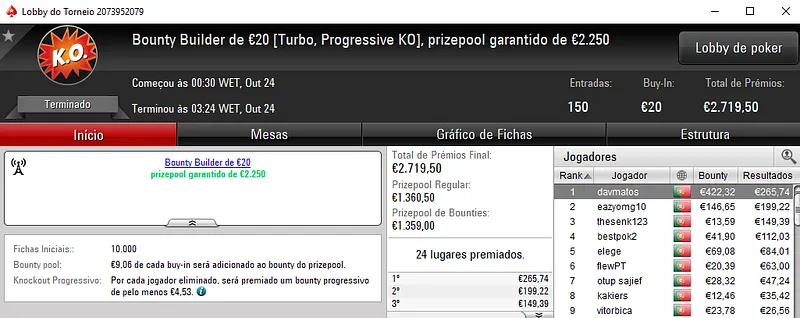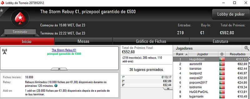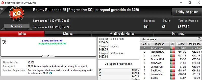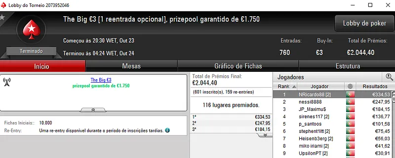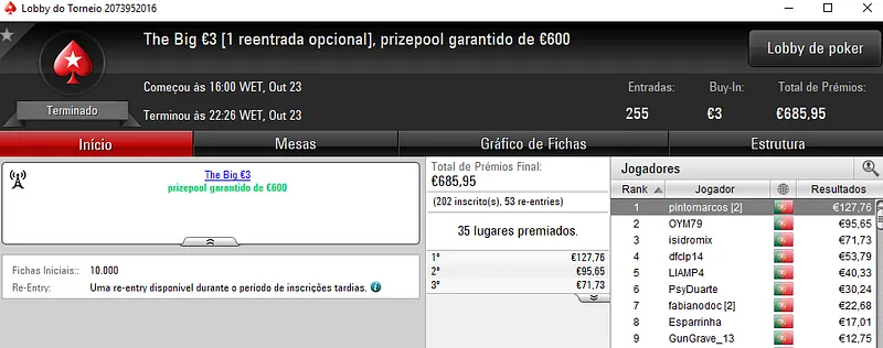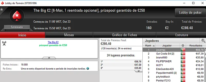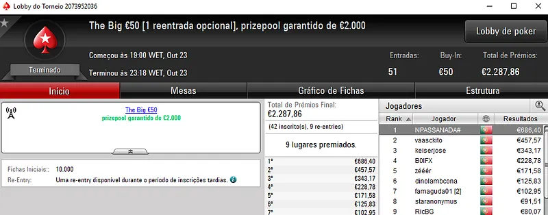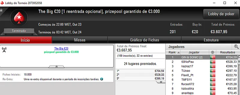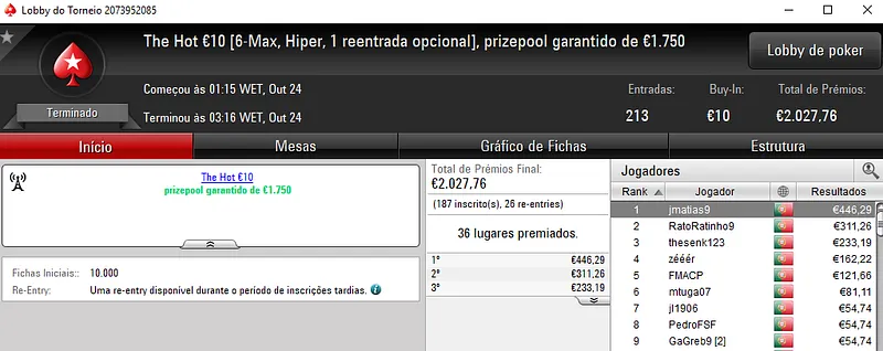 O melhor jogador do The Hot BigStack Turbo €50 foi pauloaccount que superou o field com 122 entradas para faturar €1,437 de prémio. Em segundo lugar, nounoursë arrecadou €967. A fechar o pódio, 60NoPau ainda recebeu €718 de prémio.