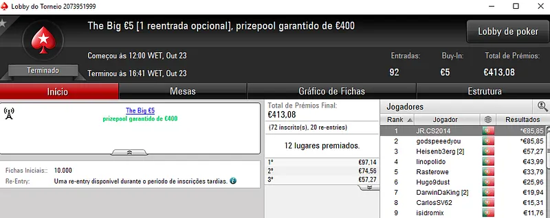 Regressando aos torneios regulares da sala da espada vermelha nacional. O The Big €100 viu serem registadas 53 entradas que perfizeram um prize pool de €4,804. O campeão foi spencer165 que em boa hora realizou duas entradas no torneio, recebeu €1,441. O mesmo aconteceu com RicBG que faturou €960 na segunda posição. Com o terceiro lugar, kakiers levou para casa €720.
