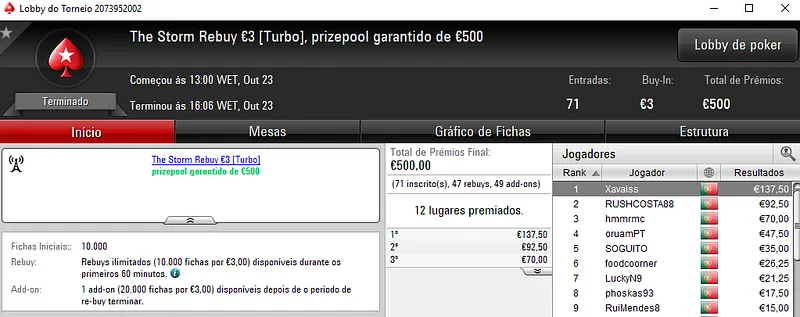 O Half Price Sunday Storm €5 assistiu a uma correria ao torneio e acolheu 2,974 entradas que fizeram o prize pool subir até aos €13,472. Com o primeiro lugar, mike_ross69 embolsou €1,535 depois de realizar acordo no 3-handed. Chaves798 terminou na segunda posição e faturou €1,350, enquanto cmsm92 garantiu €1,341 no terceiro posto.