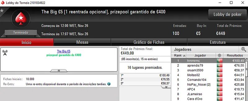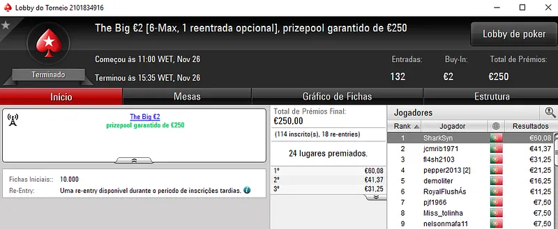 AS 332 entradas registadas no The Big €20 perfizeram um prize pool de €5,959 em que o primeiro prémio,€1,084, foi parar às mãos de xaneta7 que se sagrou campeão. TMathisen terminou na segunda posição e recebeu €812. Já bakerpt teve direito a €609 pelo terceiro posto da classificação.