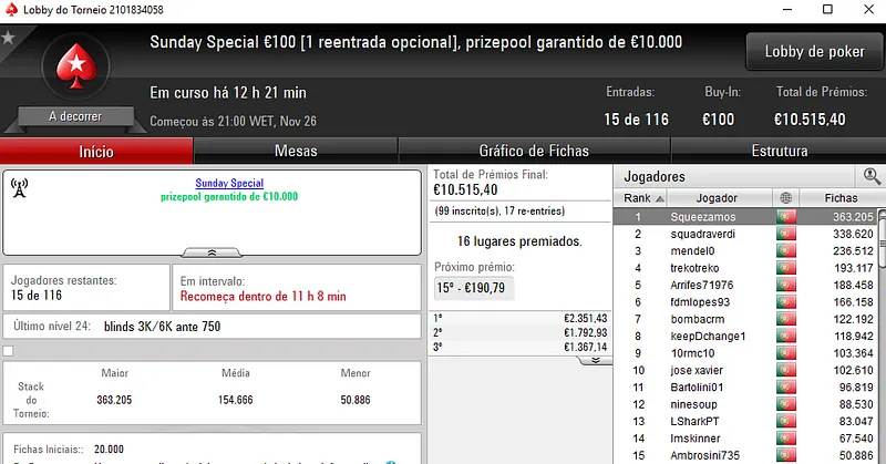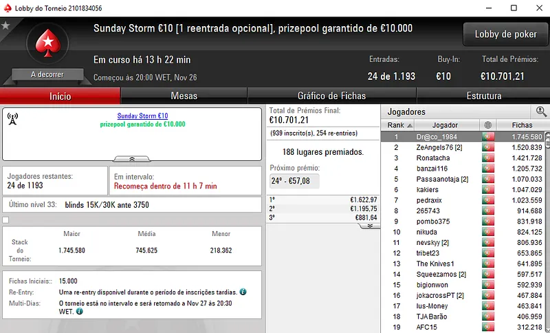 Hoje realiza-se o dia 2 do Sunday Special €100 e do Sunday Storm €10, em jogo estão mais de €21 mil.