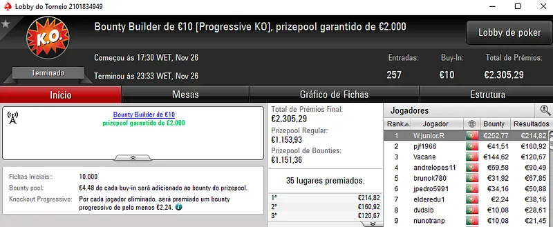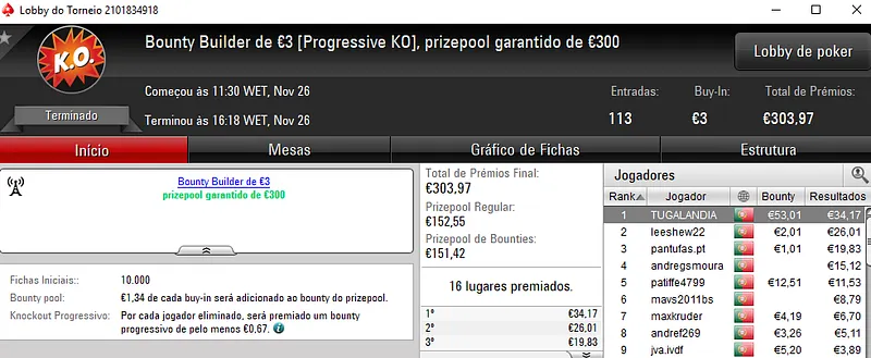 Graças aos 336 participantes, o Sunday Battle €30 acabou por entregar o segundo maior prémio do dia ao premiar Marco Abr605 com €1,856 entre prémio e bounties. O torneio contou com um prize pool total de €9,045 e no segundo posto, c.ramau teve direito a €920. O pódio fica completo com milaix que recebeu €592 no terceiro lugar.