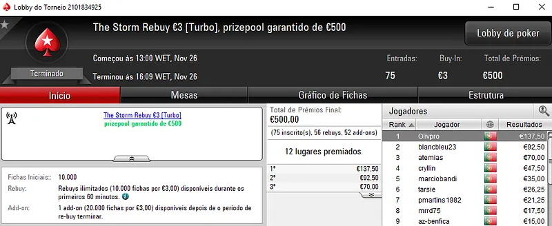 Apesar de não ver o prémio garantido de €5,000 ser suplantado, O The Storm Rebuy €10 também entregou um prémio de 4 dígitos. FCGrosso83 foi o campeão e faturou €1,100 pelo primeiro lugar. João "4lk4line.pt" Alçada terminou em segundo e recebeu €767, enquanto FMACP levou para casa €575 no terceiro posto.