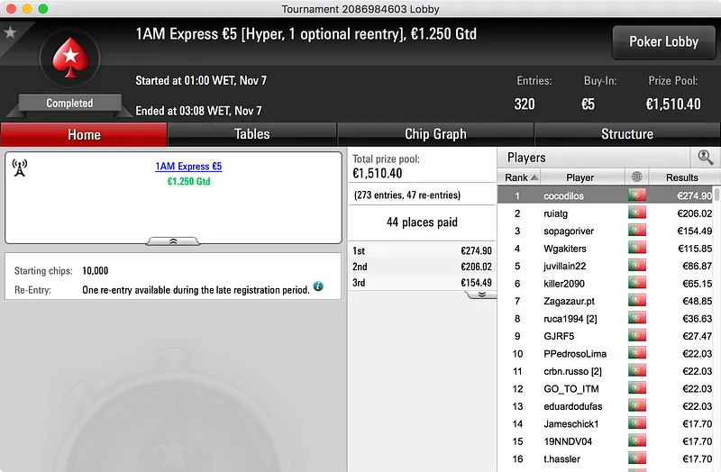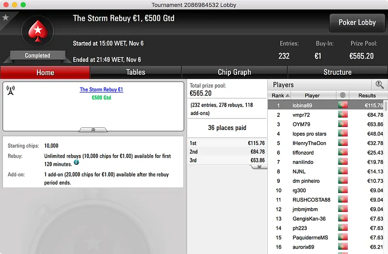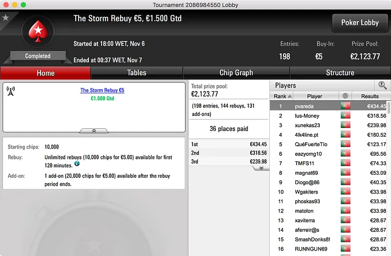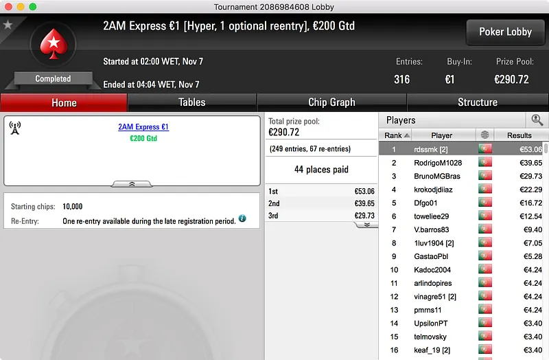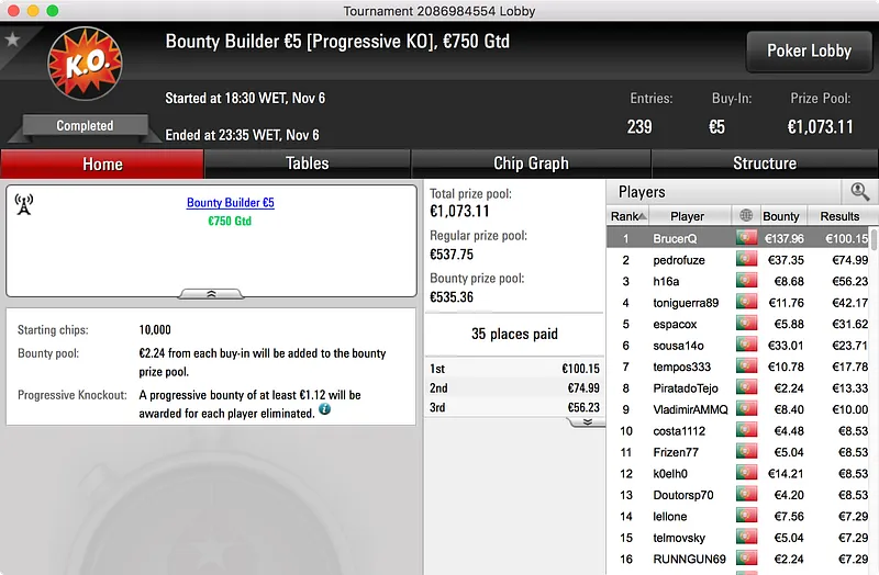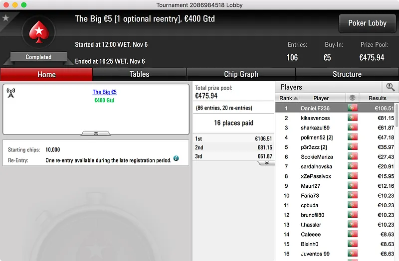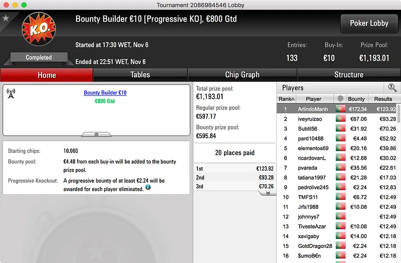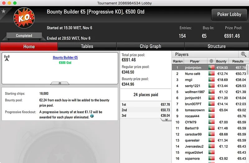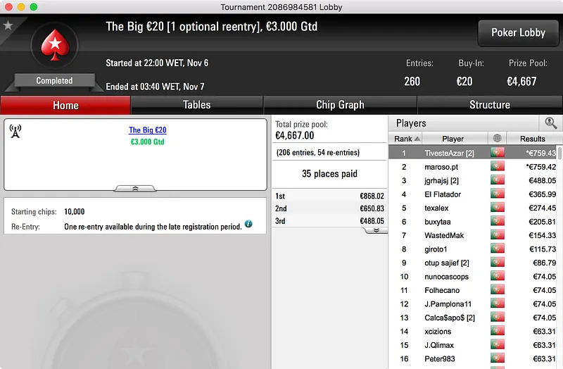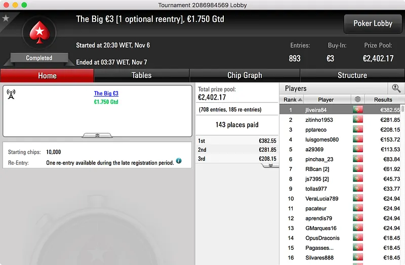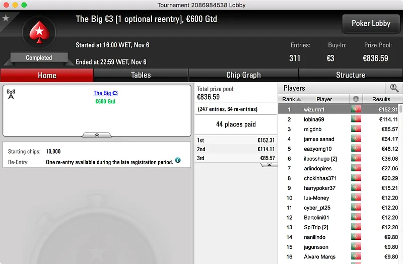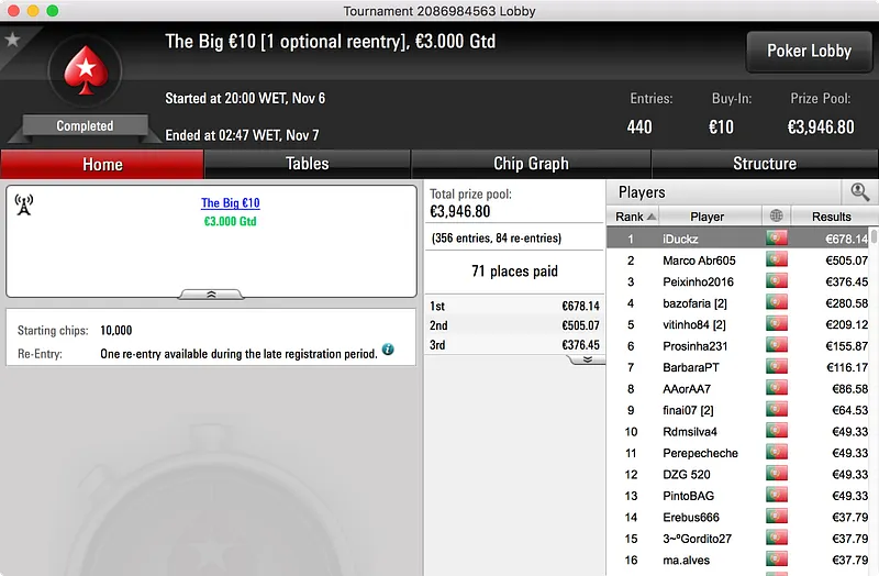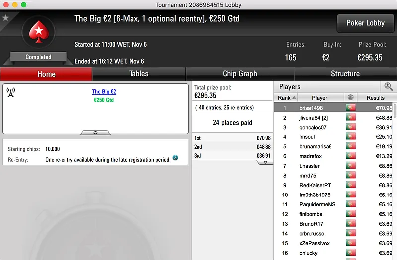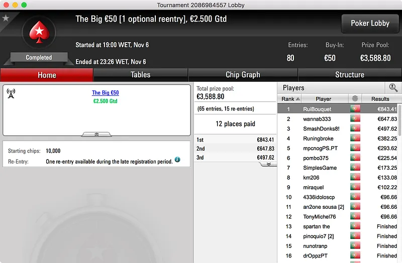O segundo maior prémio ficou no bolso de nunocassamo que ganhou o Big €100. Foram 60 os jogadores que se registaram para jogar o torneio o que resultou num prize pool de €5.439. Esse valor foi dividido por 12 jogadores e, no topo da tabela, nunocassamo e LTLT@PT acabaram por chegar a acordo para dividir o que, à data, estava por ser distribuído. Cassamo ganhou a maior fatia (€1.150) e LTLT@PT ficou com €1.109 e o segundo lugar.