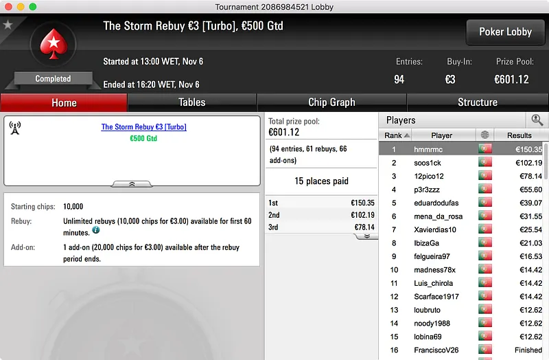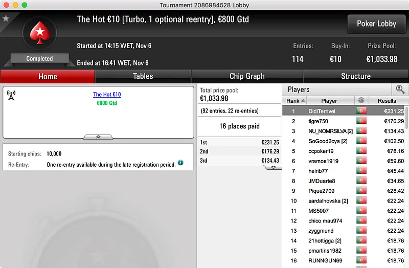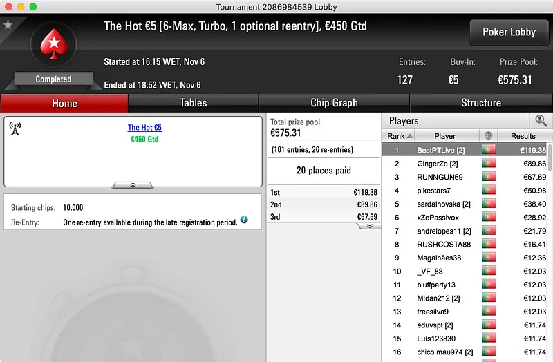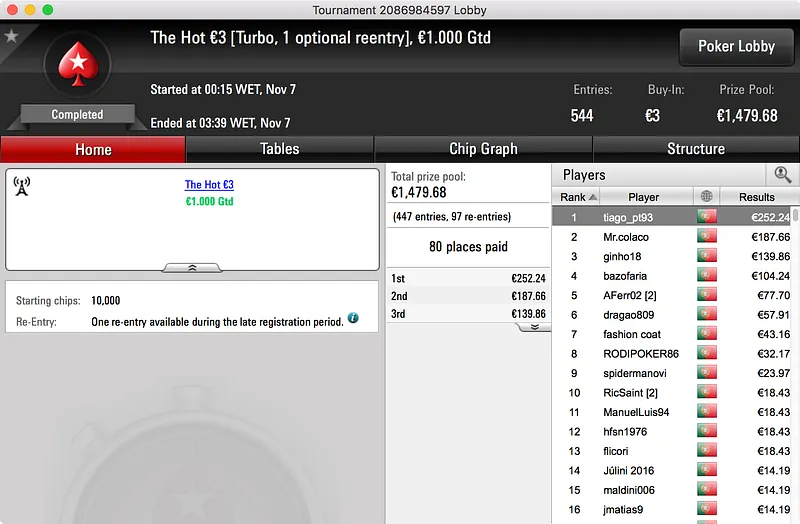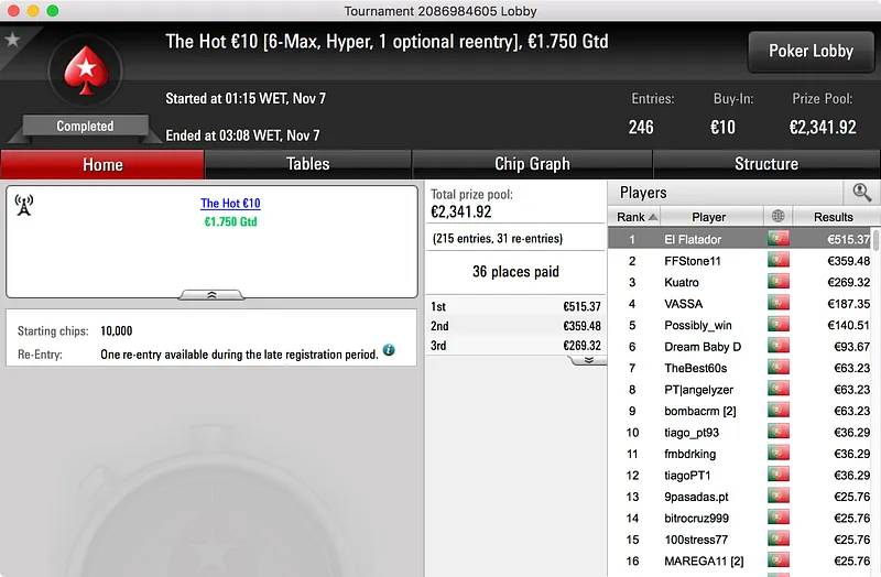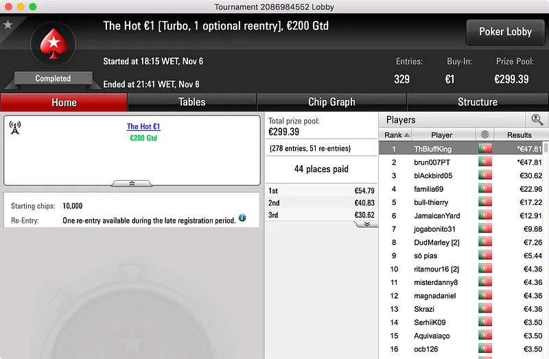 O grande destaque vai para o vencedor do Hot BigStack Turbo €50, GMorros, que bateu 159 adversários para arrecadar o primeiro prémio. O prize pool subiu aos €7.252 e foram 24 os jogadores que tiveram direito a uma fatia do mesmo. No final, petrosalsao16 (2º - €1.200) foi o último a cair às mãos do campeão que, após 3:28h de muito Poker, levou os €1.740 que lhe estavam reservados.