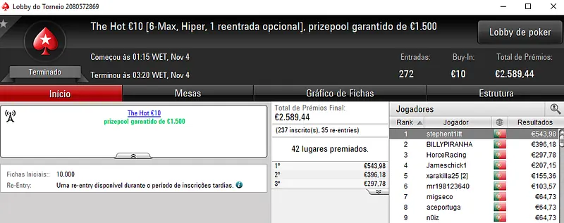 Bartolini01 venceu o The Hot BigStack Turbo €50, mas quem arrecadou o maior prémio foi jfeteiro27 depois de ambos realizarem acordo no heads-up. Bartolini01 recebeu €1,492, enquanto jfeteiro embolsou €1,577 de prémio. A terceira posição ficou reservada a OTENknows que faturou €946.