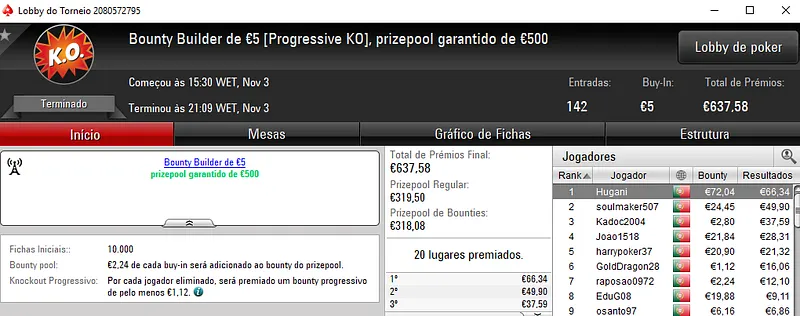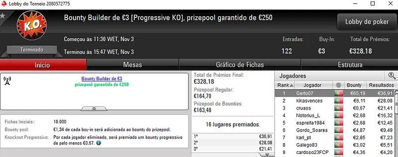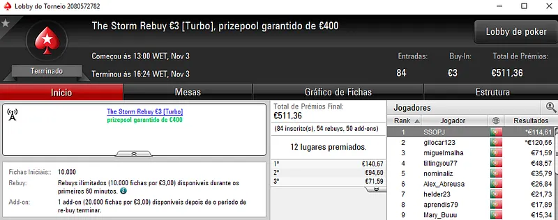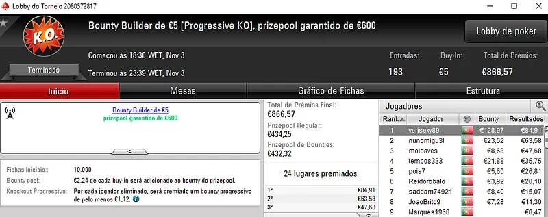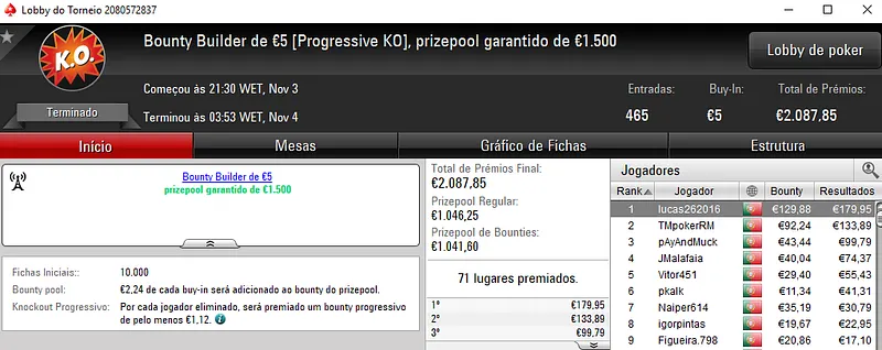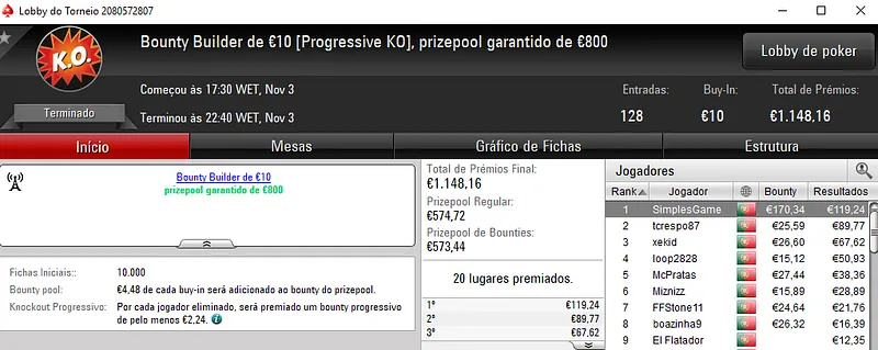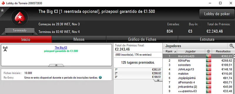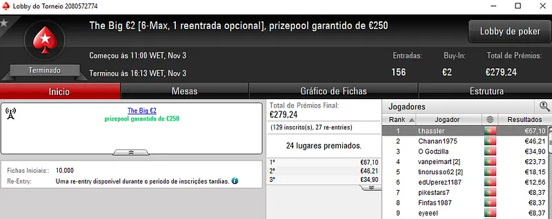 Já o The Big €100 registou 67 entradas com o prize pool a ascender aos €6,073. O maior prémio foi para o campeão SoGood2cya que arrecadou €1,427. Na segunda posição, poker4134 levou para casa €1,096, enquanto wannab333 recebeu €842 a fechar o pódio.