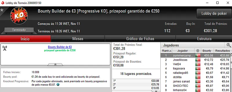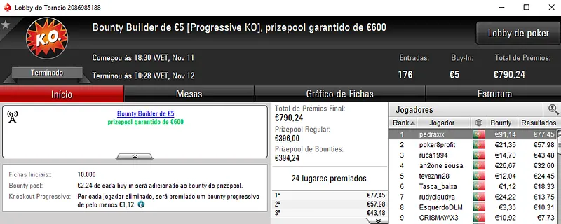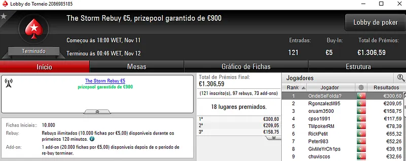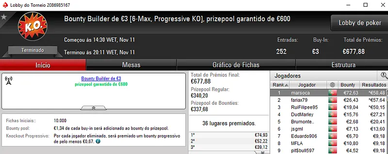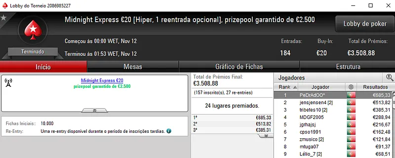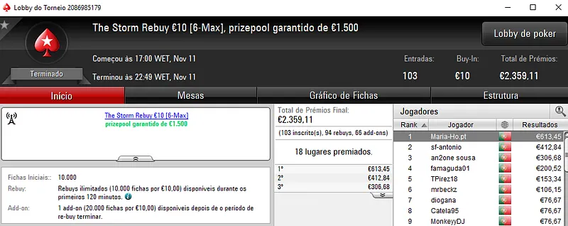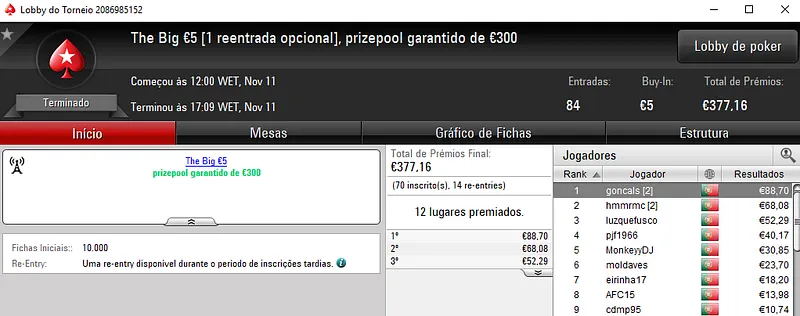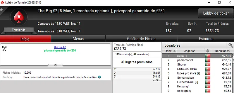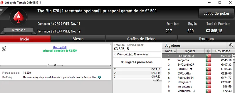 Sessão de sábado na PokerStars.pt com mais 3 prémios de 4 dígitos entregues pela sala da espada vermelha nacional. Como não poderia deixar de ser, o The Hot BigStack Turbo € 50 e o The Big €100 fizeram as honras da casa e entregaram os maiores prémios do dia.