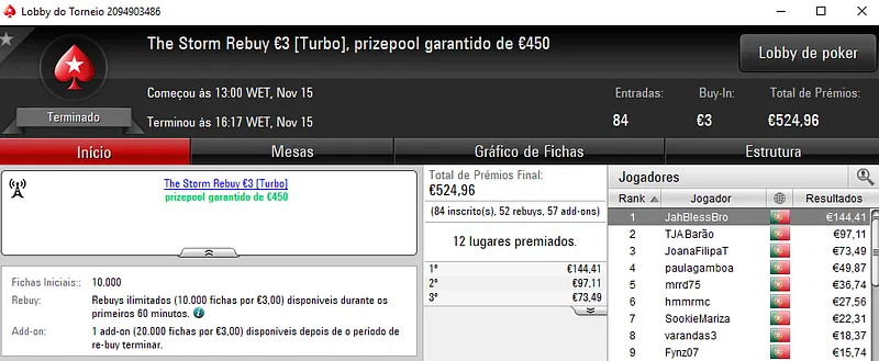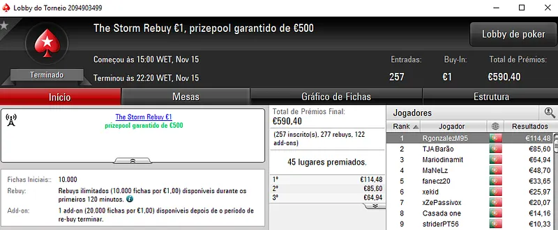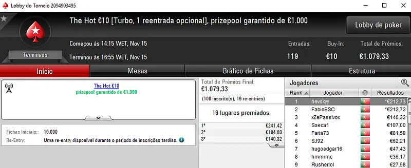 O The Hot BigStack Turbo €50 contou com 101 jogadores que realizaram 24 reentradas e que não chegaram para atingir o prize pool garantido de €6,000. Quem mais beneficiou com isso foi Pedro "whitequality" Olaio que levou para casa €1,560 de prémio pelo primeiro lugar. Ele derrotou AnaDuarte no heads-up que recebeu €1,050 de compensação. A fechar o pódio, batlaize faturou €780 no terceiro posto.