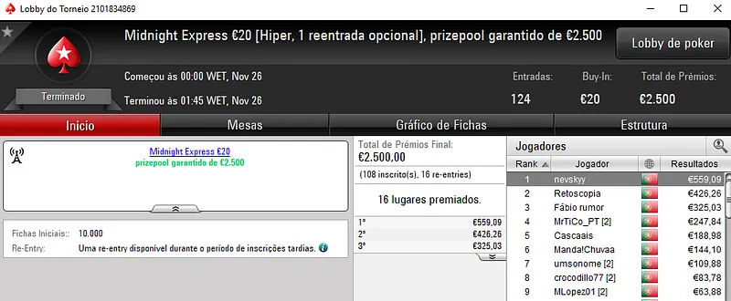 A sessão de preparação para o grande dia da semana de poker online contou com três prémios de 4 dígitos entregues pela PokerStars.pt. Squeezamos venceu o The Big €100, enquanto kYndr e Solid.BaLLS dividiram os prémios no The Hot BigStack Turbo €50. Vê aqui em baixo os campeões de ontem: