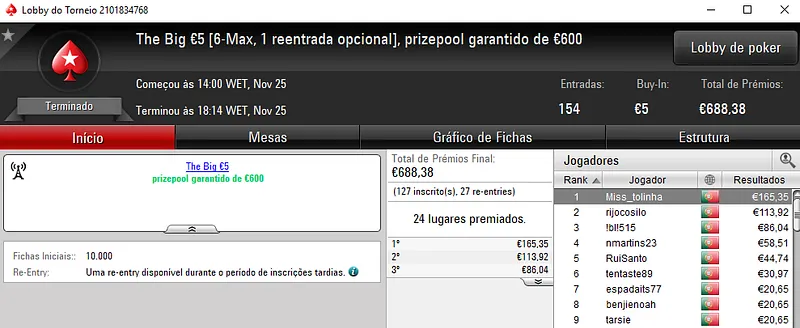 O The Big €100 contou com 32 entradas que não chegaram para atingir o prize pool garantido de €3,500 oferecido pela sala de poker. Os prémios foram repartidos pelos 6 melhores classificados, onde Squeezamos arrecadou €1,295 pelo título. No segundo posto, famaguda01 teve direito a €875, enquanto Ambrosini735 embolsou €525 na terceira posição.