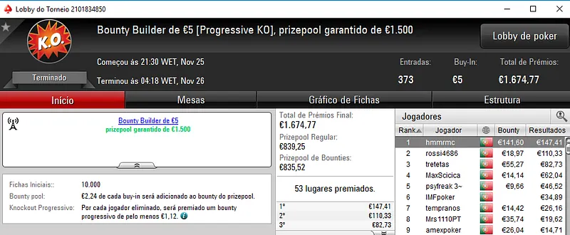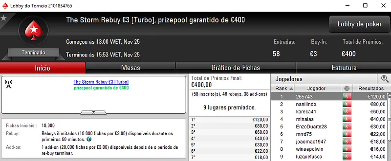 Já as 106 entradas registadas no The Hot BigStack Turbo €50 deram origem a um prize pool de €4,804, onde os prémios foram distribuídos pelos 18 melhores classificados. No topo da classificação, kYndr e Solid.BaLLS dividiram o primeiro e o segundo lugar, levando para casa €1,045 cada um. Na terceira posição do pódio, chin pestana recebeu €624 pela prestação.