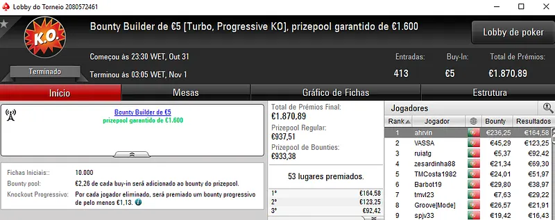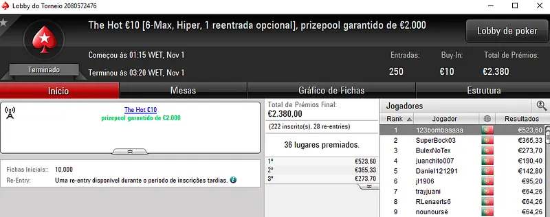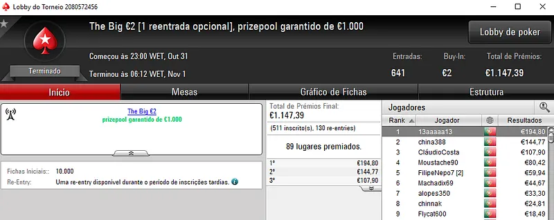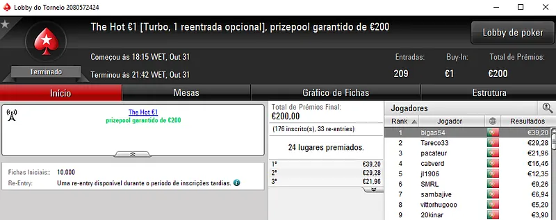 Como foi o caso de vicenT_V1337 que conquistou o The Hot BigStack Turbo €50 para receber €2,106. O torneio contou com 202 entradas que perfizeram um prize pool de €9,156, onde 30 jogadores saíram com prémio. Na segunda posição, upapaoutai arrecadou €1,465, enquanto fmbdrking levou €1,098 na terceira posição.